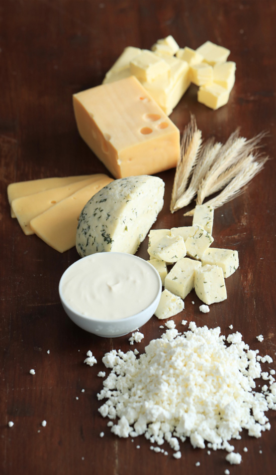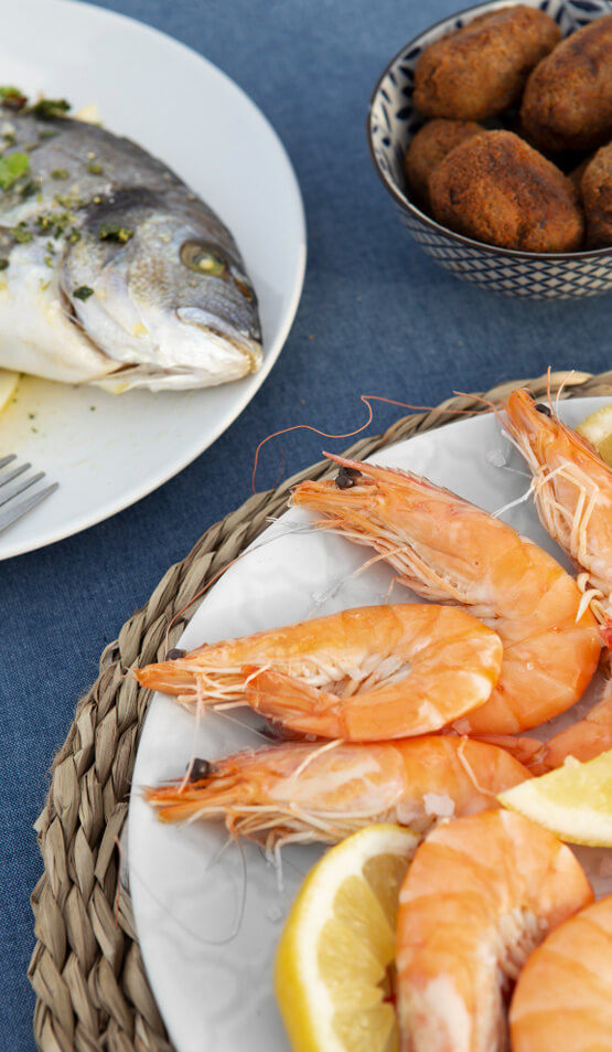 Variety of shrimps and fish including sea-caught and aquacultured; dairy foods.